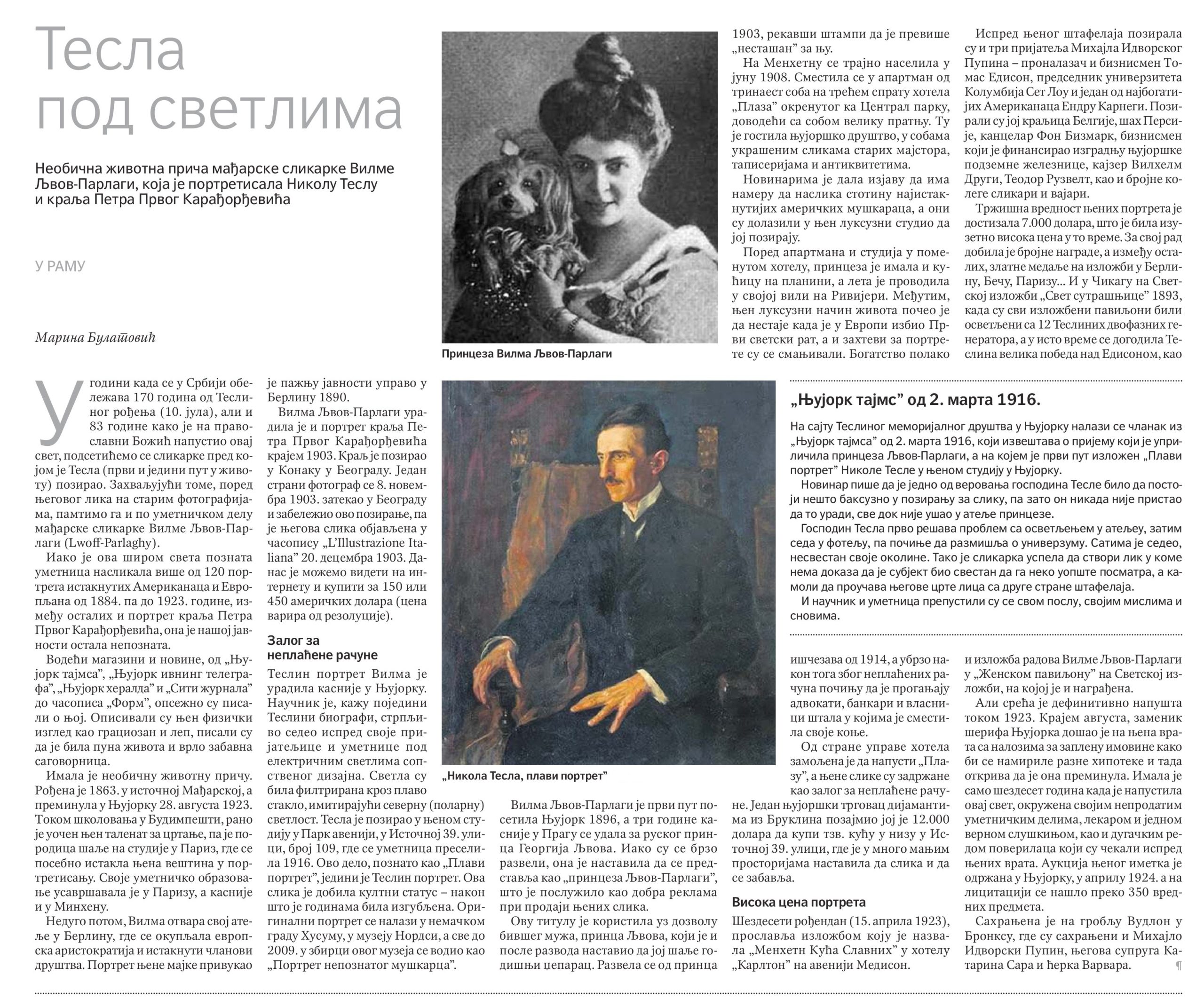 The website of the Tesla Memorial Society of New York features an article from the New York Times dated 2 March 1916, reporting on a reception given by Princess Lwoff-Parlaghy, at which Nikola Tesla’s Blue Portrait was exhibited for the first time in her New York studio.